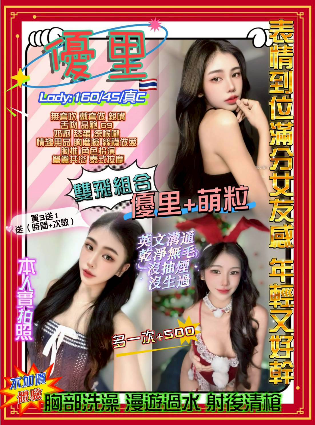 無套吹/親嘴/舌吻/品鮑/69/奶炮/胸推/屁推/按摩/懶人澡/水中蕭/冰火吹/情趣用品(自備/絲襪(自備/角色扮演(自備